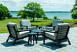The Dex Club Chair Set includes four comfortable club chairs, a coordinating side table, and a round chat table—perfect for relaxed conversations and everyday outdoor living.